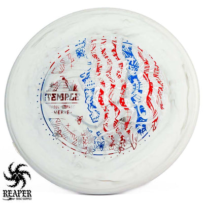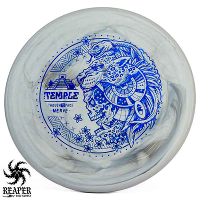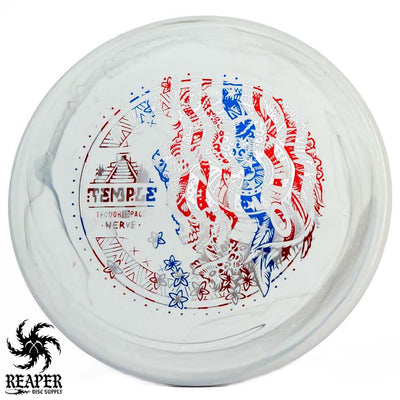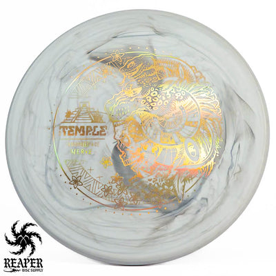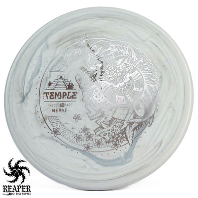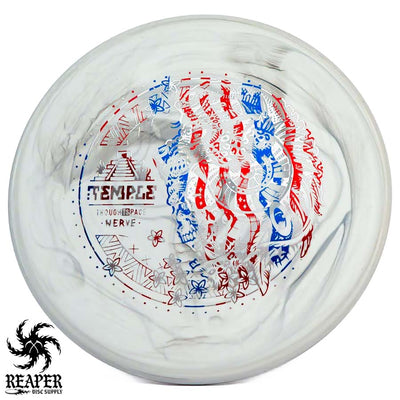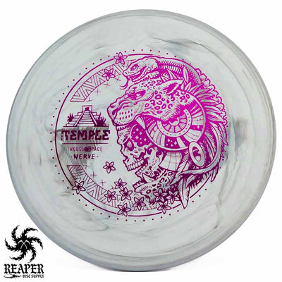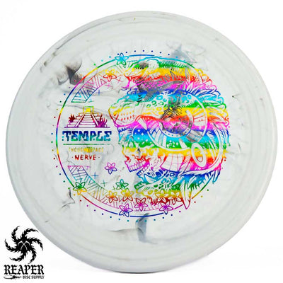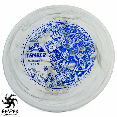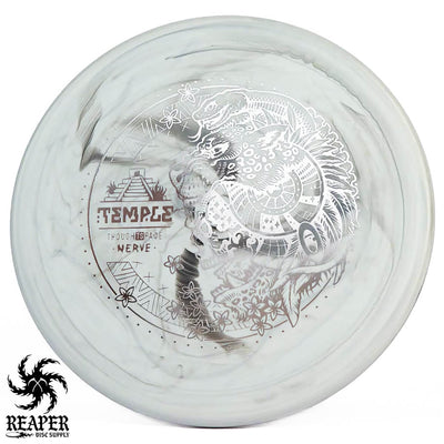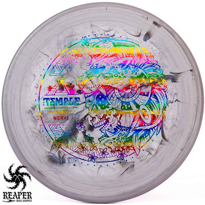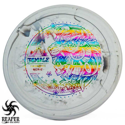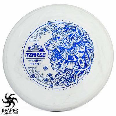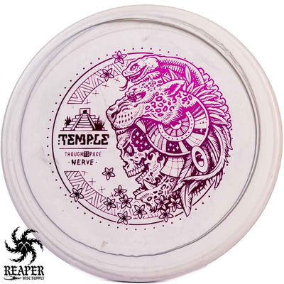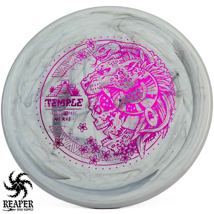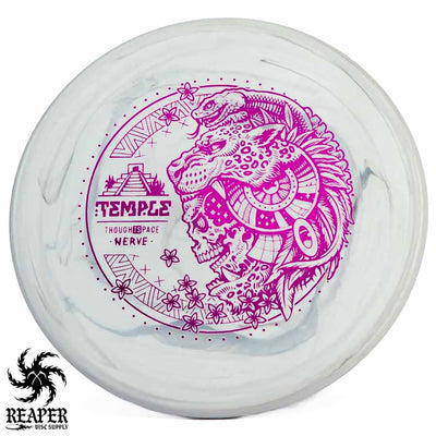 This new run of Thought Space Temple is made with a new Test Blend Nerve plastic. This plastic has a super cool patchy looking color effect and is just as grippy as the previous run of Nerve plastic. The Temple is a unique approach disc with a slight dome "bubble" in the center of the flight plate.