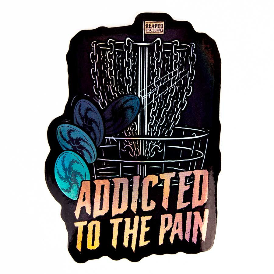 These are holographic disc golf stickers with our hand-drawn 'Addicted To The Pain' design. They are about 4 inches wide and made with permanent sticking all-weather aluminum that sticks well to almost any surface.