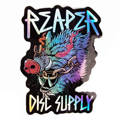 These are holographic disc golf stickers with our hand-drawn 'Chained Boar' design. They are about 4 inches tall and made with permanent sticking all-weather aluminum that sticks well to almost any surface.