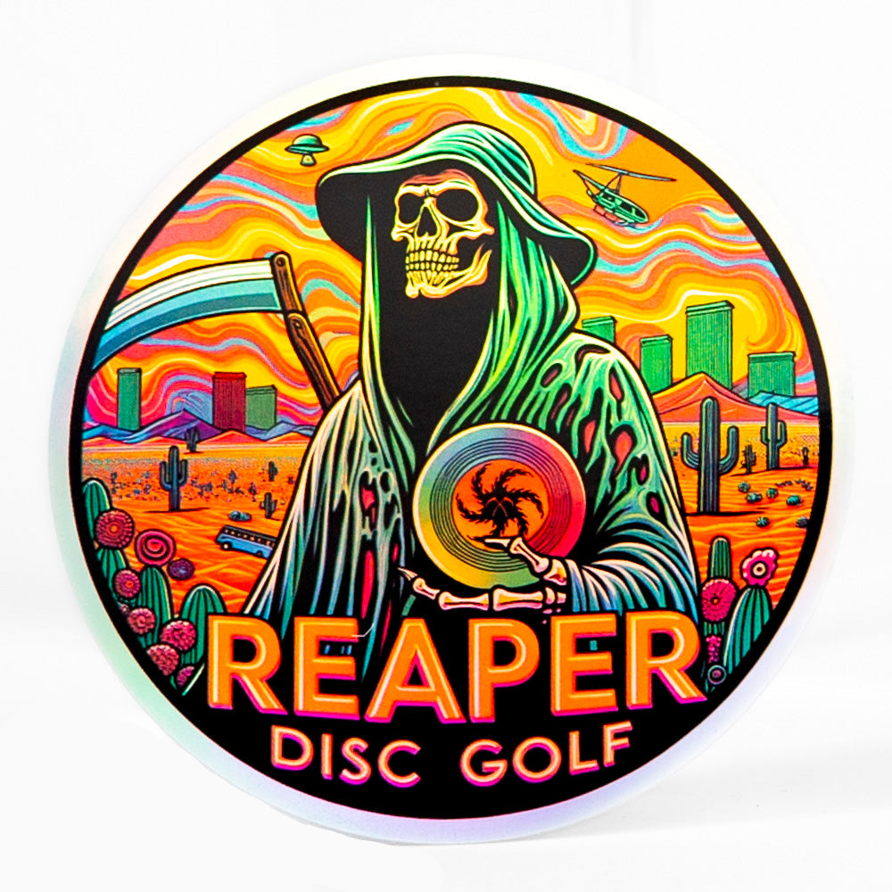 These 'Fear and Reaper in Las Vegas' parody stickers feature a psychedelic, bucket-hat-wearing grim reaper in the LV desert. High-quality UV holographic die-cut circular stickers.