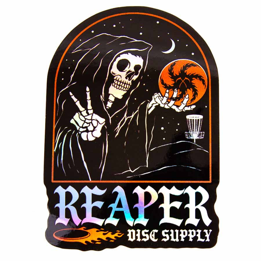 These are holographic disc golf stickers with our hand-drawn 'Grim Reaper' design. They are approximately 4 inches tall and made of permanent adhering all-weather aluminum that adheres to almost any surface.