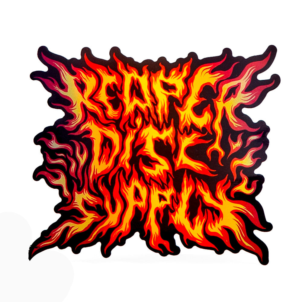 Introducing our second death metal-themed die-cut sticker, this time featuring hand-drawn 'Reaper Disc Supply' flames. Made with UV-proof, ultra-durable holographic material.
