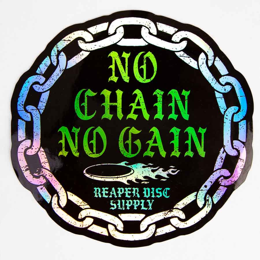 These are holographic disc golf stickers with our hand-drawn 'No Chain No Gain' design. They are about 4 inches tall and made with permanent adhering all-weather aluminum that sticks well to almost any surface.