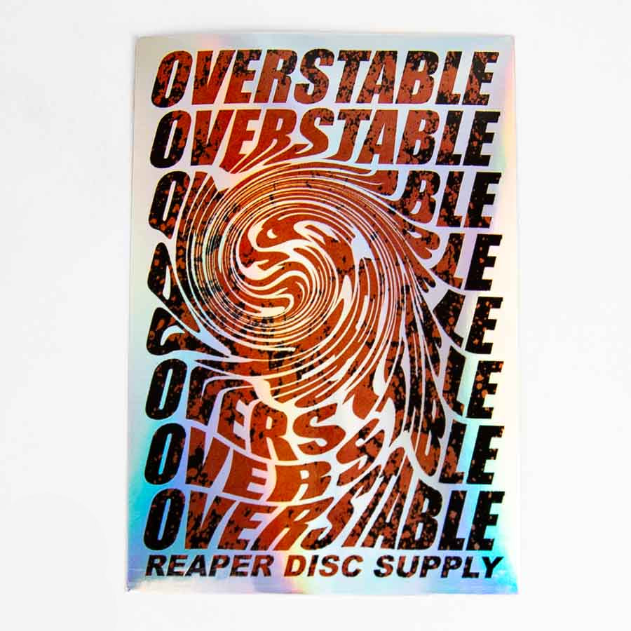 These are holographic disc golf stickers with our hand-drawn 'Overstable' design. They stand about 4 inches tall and are made of permanent all-weather aluminum that adheres to almost any surface.