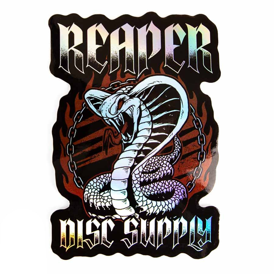 These are holographic disc golf stickers with our hand-drawn 'Cobra' design. They are about 4 inches tall and made with permanent sticking all-weather aluminum that sticks well to almost any surface.