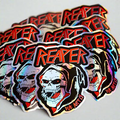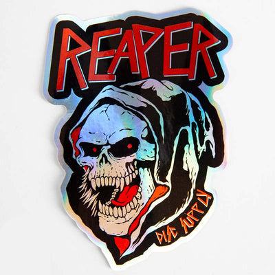 How could we not have a sticker with a grim reaper on it? These hand-drawn stickers are made with weatherproof holographic PVC that will last for years.