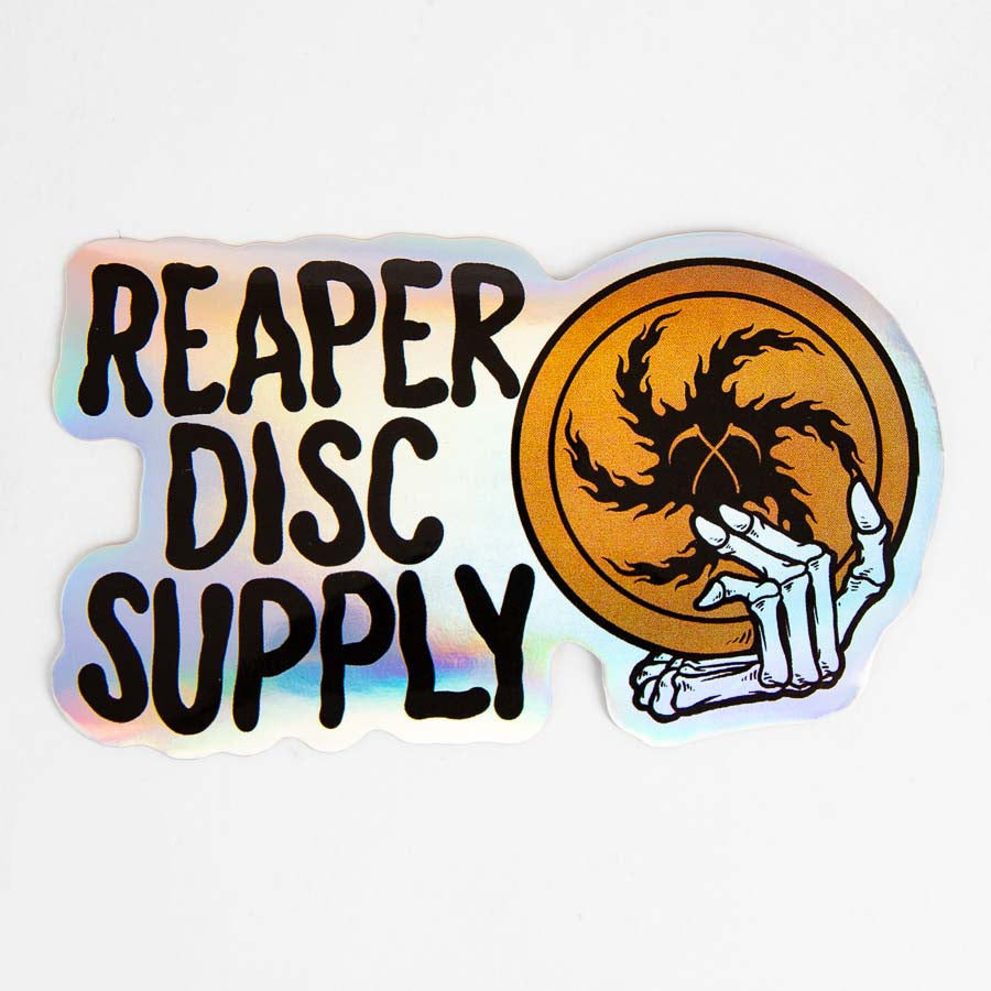 A holographic sticker that features a hand-drawn skeleton holding a disc with the Reaper logo on it. These are about 4" long and made with permanent adhering all-weather aluminum.