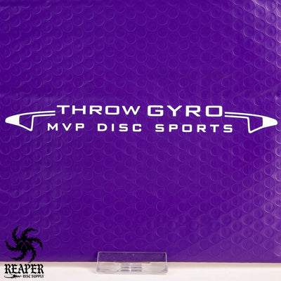These white vinyl decal stickers say 'Throw Gyro MVP Disc Sports' and are approximately 9" long. They feature a translucent backing so that you can easily stick only the vinyl onto most surfaces.