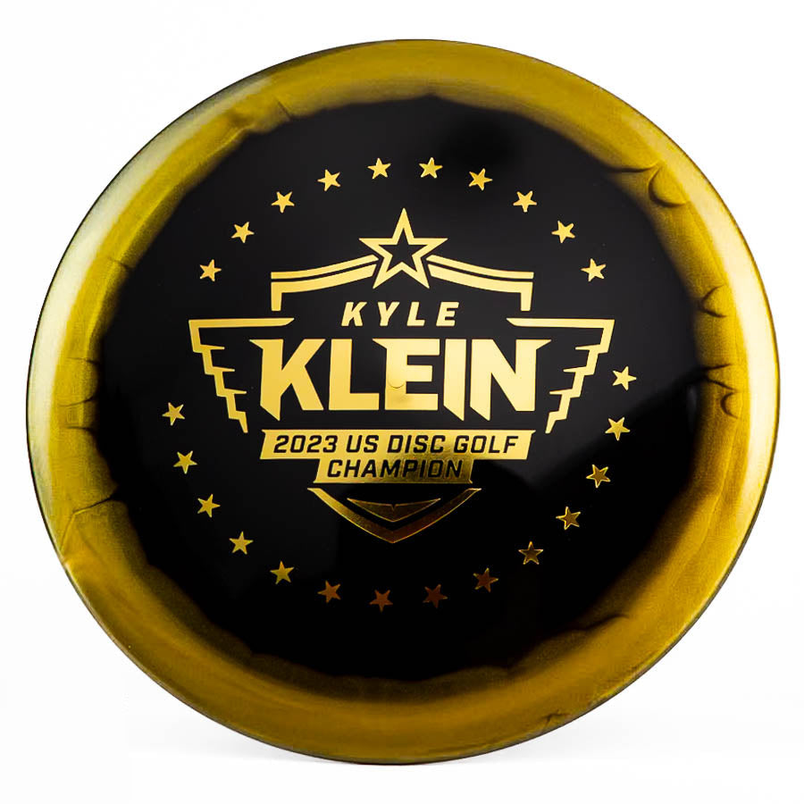 The Kyle Klein Horizon Vanguard is a special edition fairway driver celebrating Kyle Klein's victory as the 2023 United States Disc Golf Champion. This golden-themed disc, part of the Creator Series, features a black flight plate, golden rim, and gold foil stamps, offering a unique and premium design.