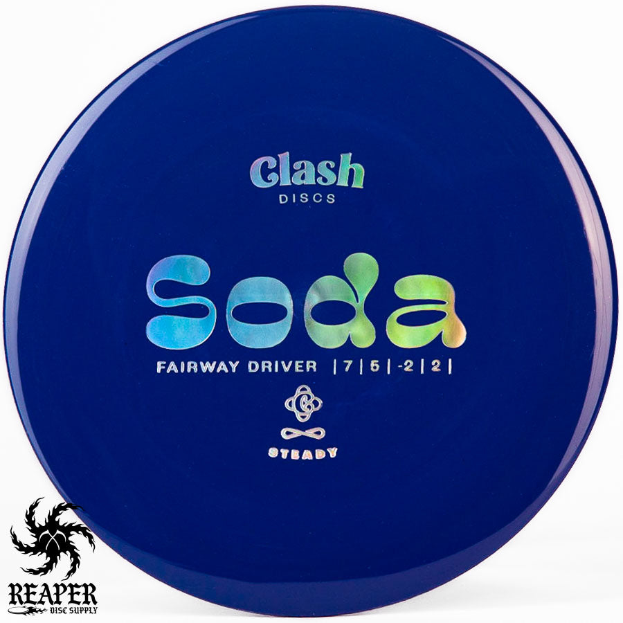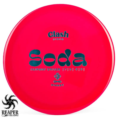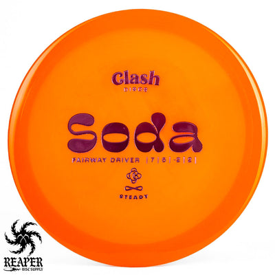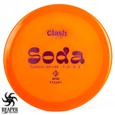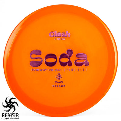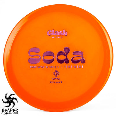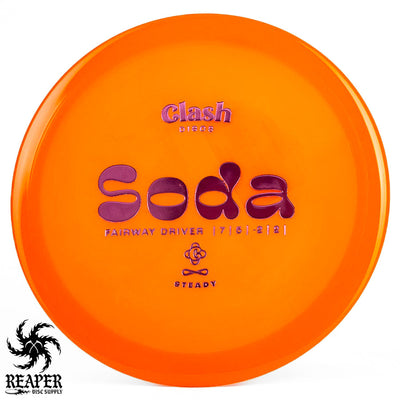 The Clash Discs Soda in Steady plastic is a beginner-friendly fairway driver with a small rim profile and a ton of glide. This disc is an excellent first driver for beginner players; it is very easy to control, it doesn't require a lot of power, and you can shot shape with it rather effortlessly. If you are a new player struggling to get more distance then this stable to understable fairway driver may be the perfect solution. It flies similarly to the Innova Leopard but with a smaller rim which is much easier to control.