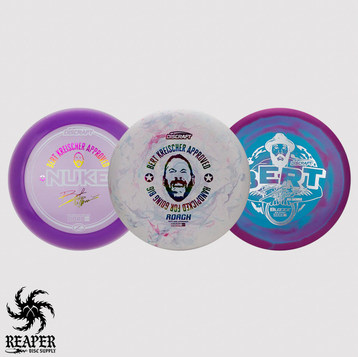 Get ready to take your disc golf game to the next level with the Discraft Bert Kreischer DGLO Exclusive 3 Disc Pack. Handpicked by the one and only Bert Kreischer himself, this pack features three of Discraft's most popular molds: