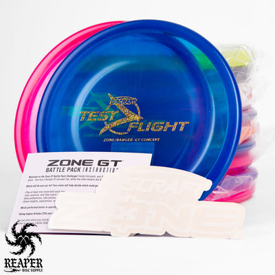 Welcome to the frontlines of disc golf evolution with the Zone GT Battle Pack! This pack proudly houses two distinct Zone GT discs, each sporting an individual concept top design inspired by the eminent Banger GT and Ringer GT. Why two, you ask? We're letting your hands, and votes, decide the fate of these unique discs. The ultimate question is: Which disc will become the next PDGA approved stock Discraft disc?