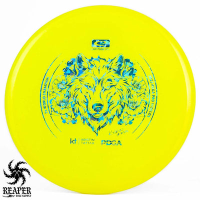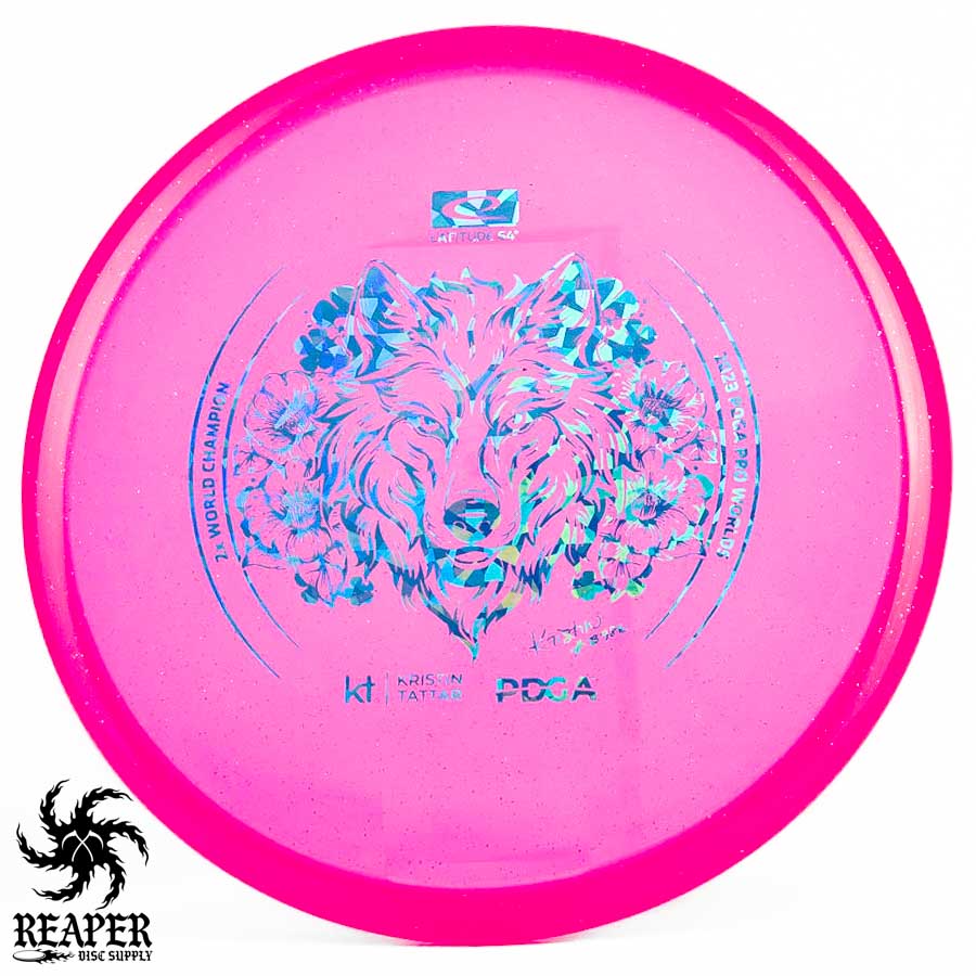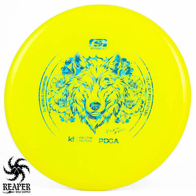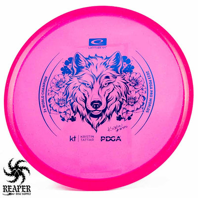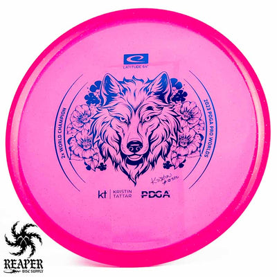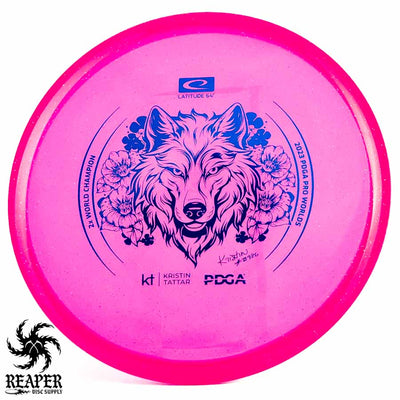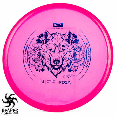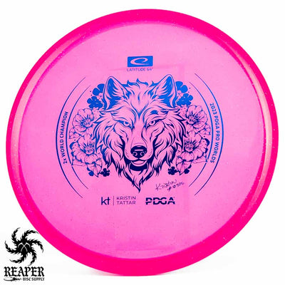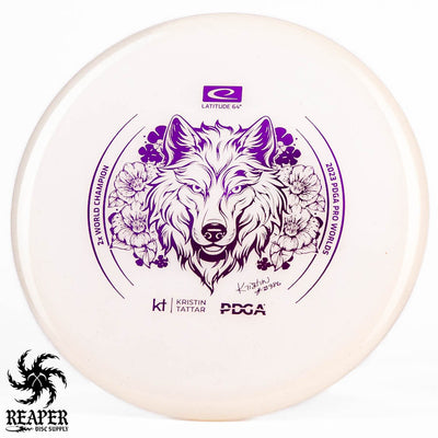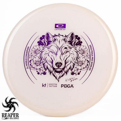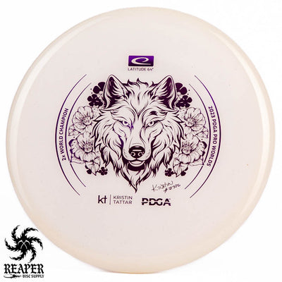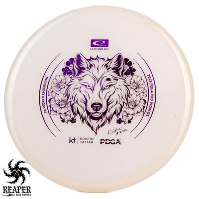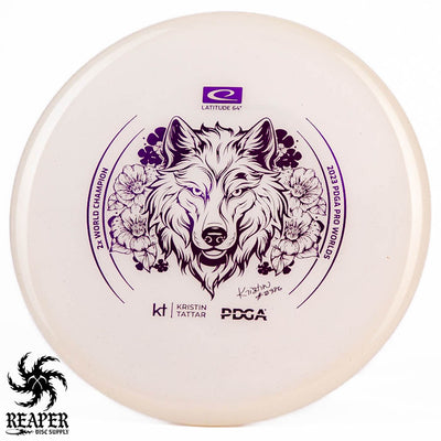 Introducing the Latitude 64 Opto-X Pure Kristin Tattar 2X World Champion Stamp 2023. This special edition disc celebrates Kristin Tattar's 2nd World Championships win. With a comfortable grip, minimal fade, and Opto-X's durability, this disc is your new secret weapon for putting and approach shots. Elevate your game with the Opto-X Pure.
