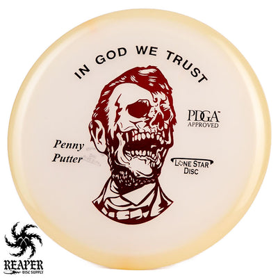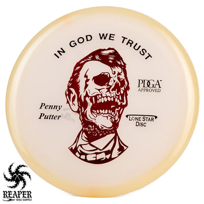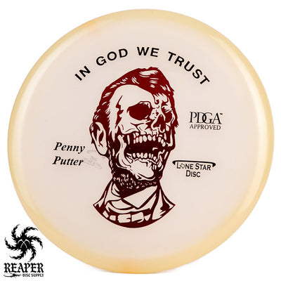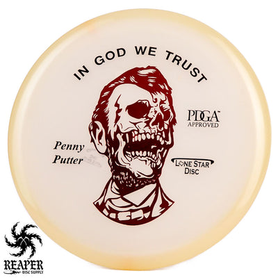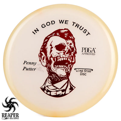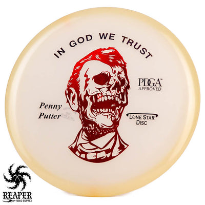 Get into the Halloween spirit with the Lone Star Discs Glow Penny Putter. This limited edition disc is perfect for those spooky night rounds. Featuring a dependable, neutral flight with a touch of fade, the Penny Putter is ideal for navigating wooded courses, hitting tight gaps, and executing precise upshots. With its glow-in-the-dark design, you can keep the game going even after the sun sets. Don't miss out on this Halloween treat - grab the Lone Star Discs Glow Penny Putter and light up the course with your skills.
