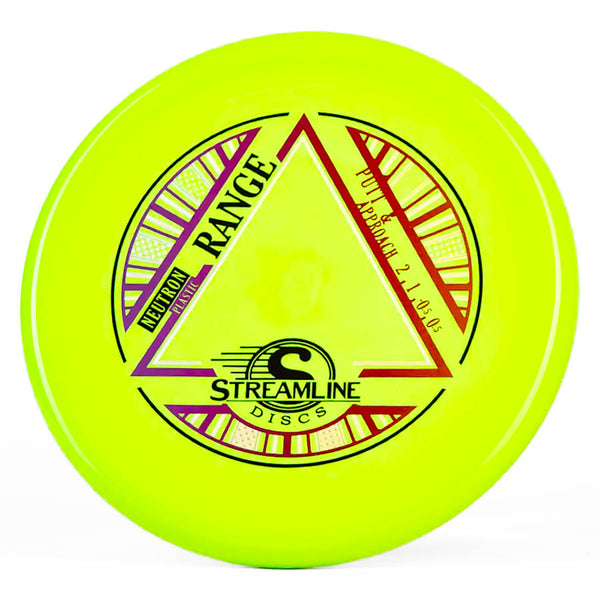 The Streamline Neutron Range is a specialized utility approach disc designed for pinpoint accuracy and exceptional control. Crafted from Streamline's premium Neutron plastic, this disc offers a comfortable grip and durable feel that's ideal for precise shots. With minimal glide and a flight rating of 2 | 1 | -0.5 | 0.5, the Range quickly drops, preventing overshooting on tricky greens and tight gaps. It reliably holds your chosen angle—whether hyzer or anhyzer—without drifting off-course. Similar yet subtly different from the Kastaplast Berg, the Range provides a touch more glide and distance, making it an excellent choice for scrambling in the woods or confidently attacking the basket on challenging approaches.