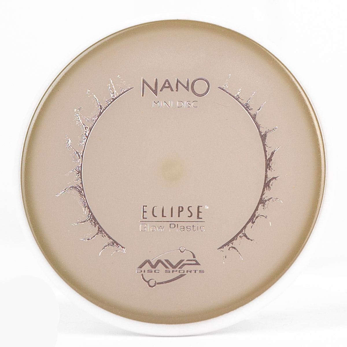 The MVP Eclipse Glow Nano Mini Disc stands out with its ultra-bright, glow-in-the-dark Eclipse Glow 2.0 plastic, featuring a striking white overmold for enhanced visibility. This PDGA-approved mini disc, part of the 5mm class, is perfect for marking your lie or engaging in mini disc golf games, providing a versatile tool for players. When thrown in mini disc golf, its neutral stable design mimics the flight characteristics of a stable driver, offering reliable and consistent performance.