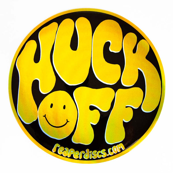 These are holographic disc golf stickers with our hand-drawn 'Huck Off' design. They are about 4 inches wide and made with permanent sticking all-weather aluminum that sticks well to almost any surface.