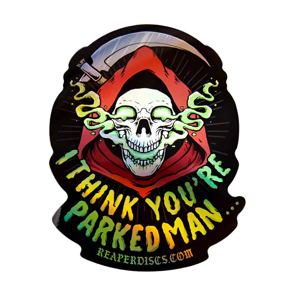 Our I think You're Parked Man parody stickers are made with weatherproof holographic PVC and will stick to just about anything (for a long time.)