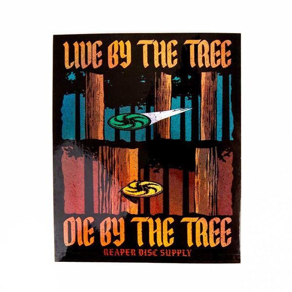 These are holographic disc golf stickers with our hand-drawn 'Live By The Tree' design. They are about 4 inches wide and made with permanent sticking all-weather aluminum that sticks well to almost any surface.