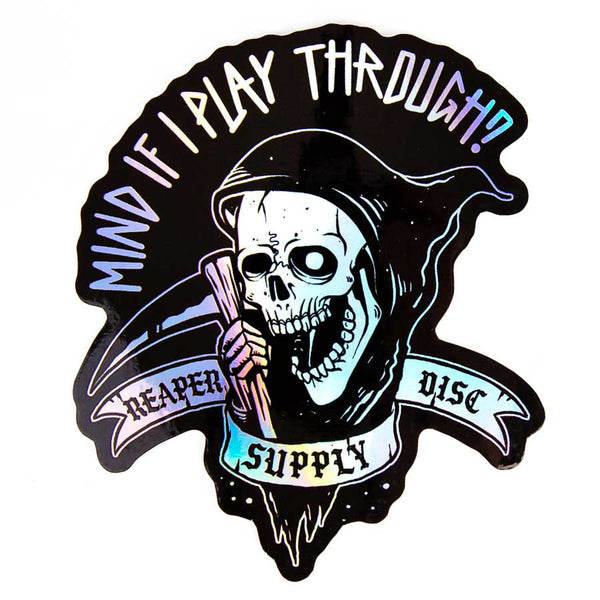 These are holographic disc golf stickers with our hand-drawn 'Play Through' design. They stand about 4 inches tall and are made of permanent all-weather aluminum that adheres to almost any surface.