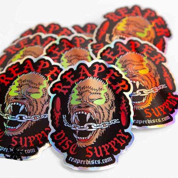 These holographic Gorilla sticker features a pissed off gorilla, chains, and two flaming Reaper logos. Awesome for your laptop, car, or whatever.