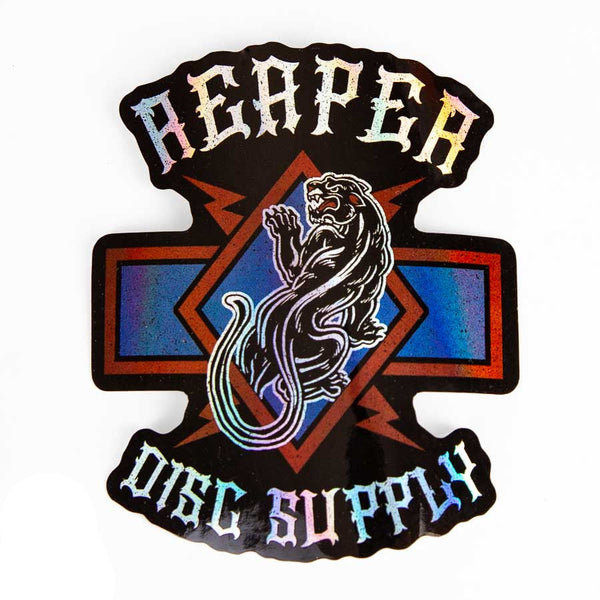A holographic sticker that features a hand-drawn panther design. These are about 4" long and made with permanent adhering all-weather aluminum.