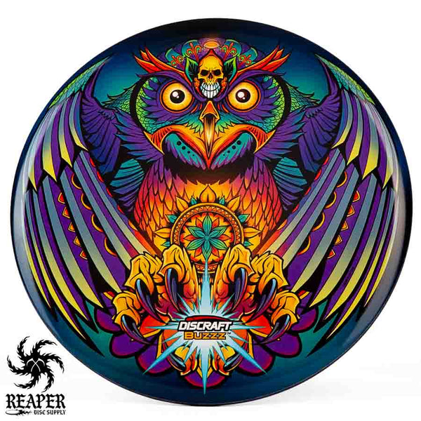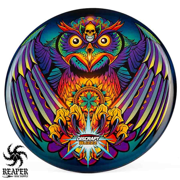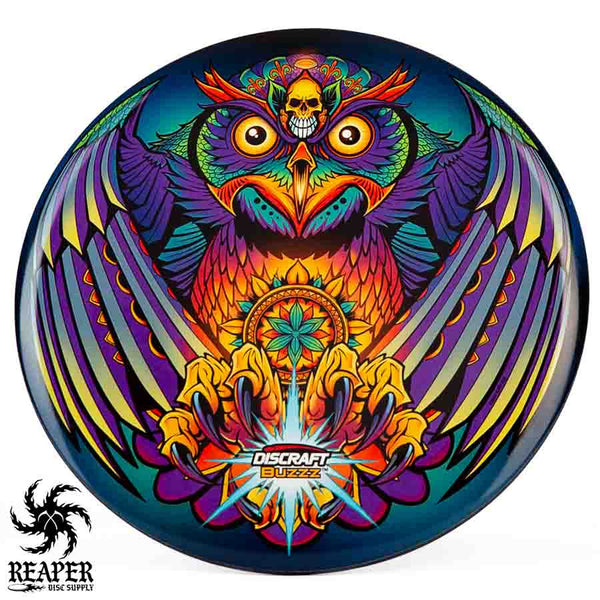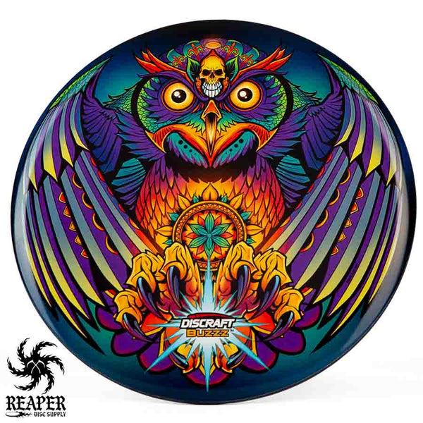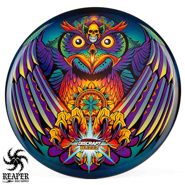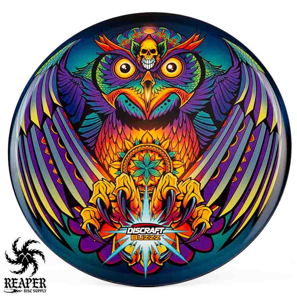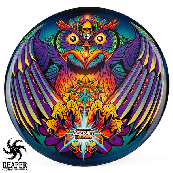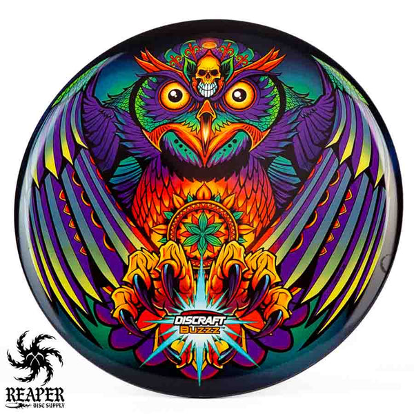 Brian Allen designed the illustration on this Discraft Supercolor 'Owl' Buzzz, which features a vibrantly colored bird and it's talons.