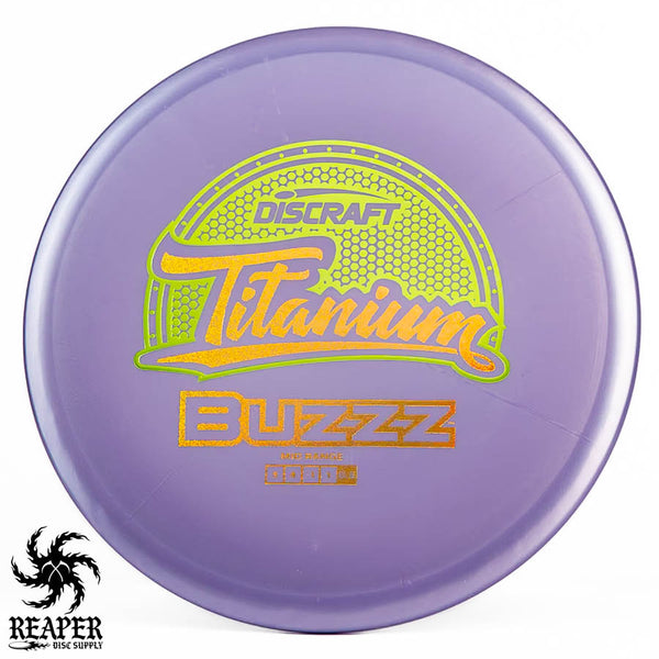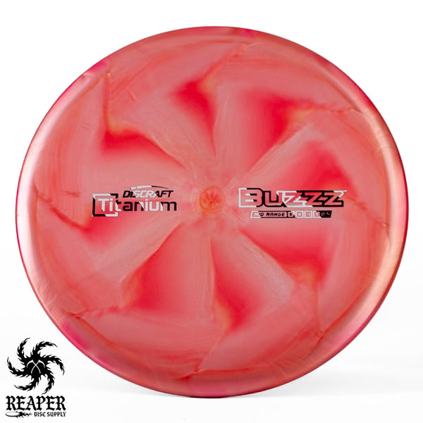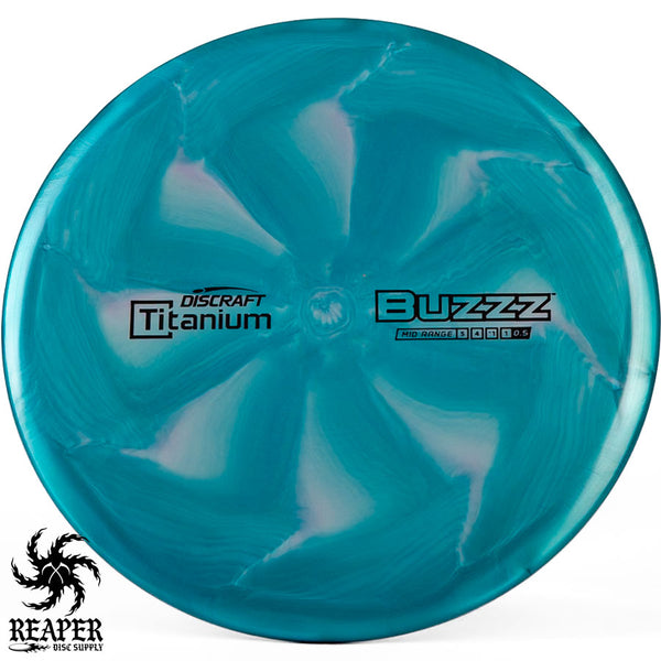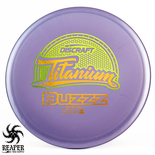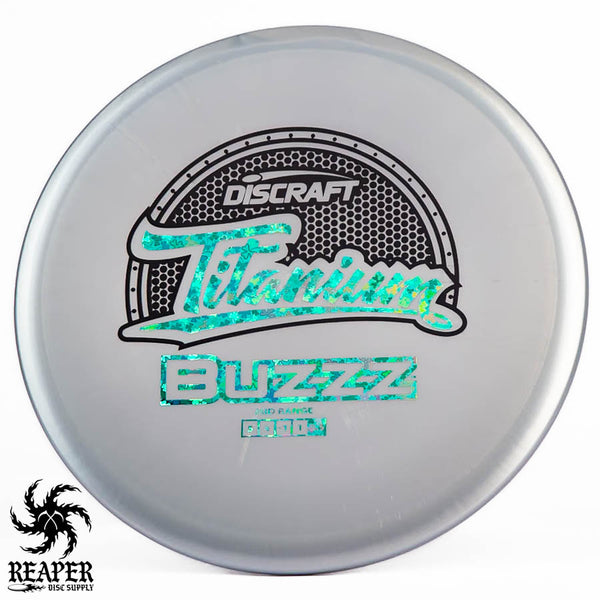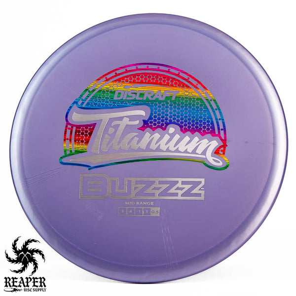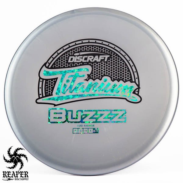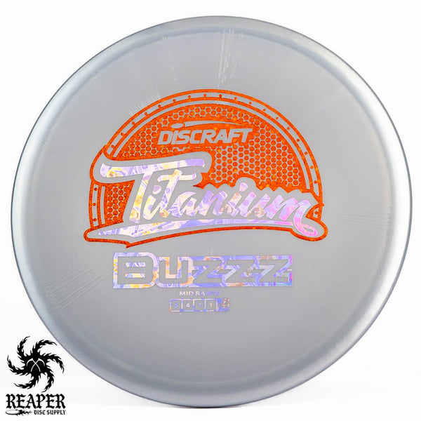 The Discraft Titanium Buzzz is a stable midrange made with gorgeous shimmery plastic and a two color stamp. Titanium plastic is a stable, somewhat firm premium plastic that can handle lots of damage and maintain its stability. The Titanium Buzzz is a fantastic addition to any player's bag, regardless of skill level.
