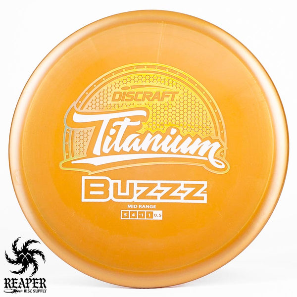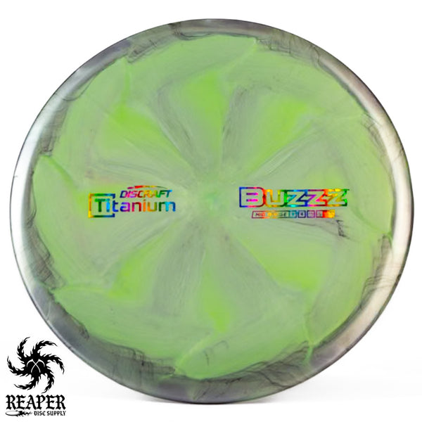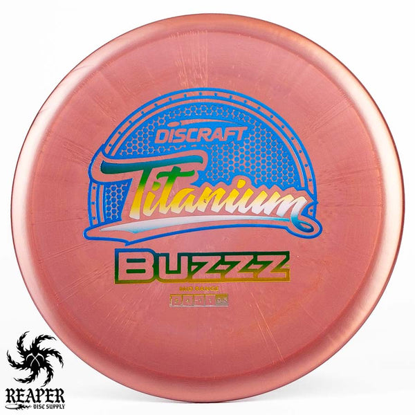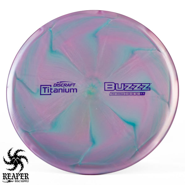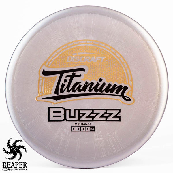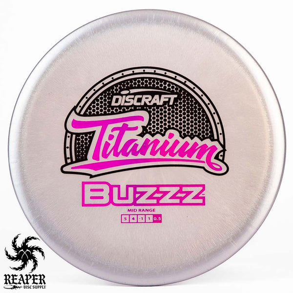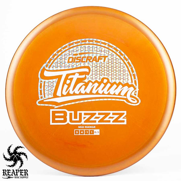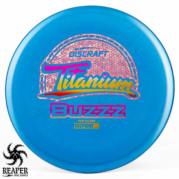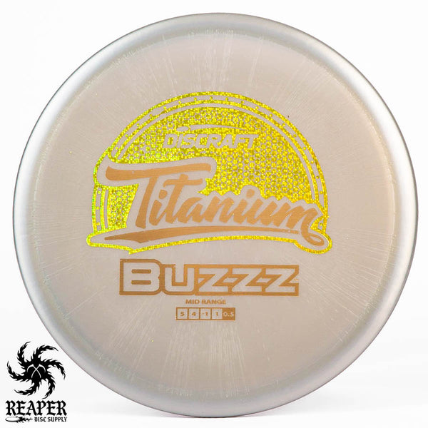 The Discraft Titanium Buzzz is a stable midrange made with gorgeous shimmery plastic and a two color stamp. Titanium plastic is a stable, somewhat firm premium plastic that can handle lots of damage and maintain its stability. The Titanium Buzzz is a fantastic addition to any player's bag, regardless of skill level.