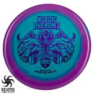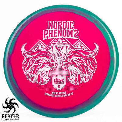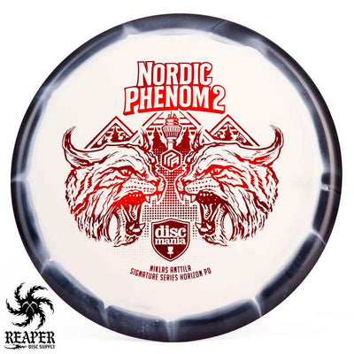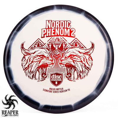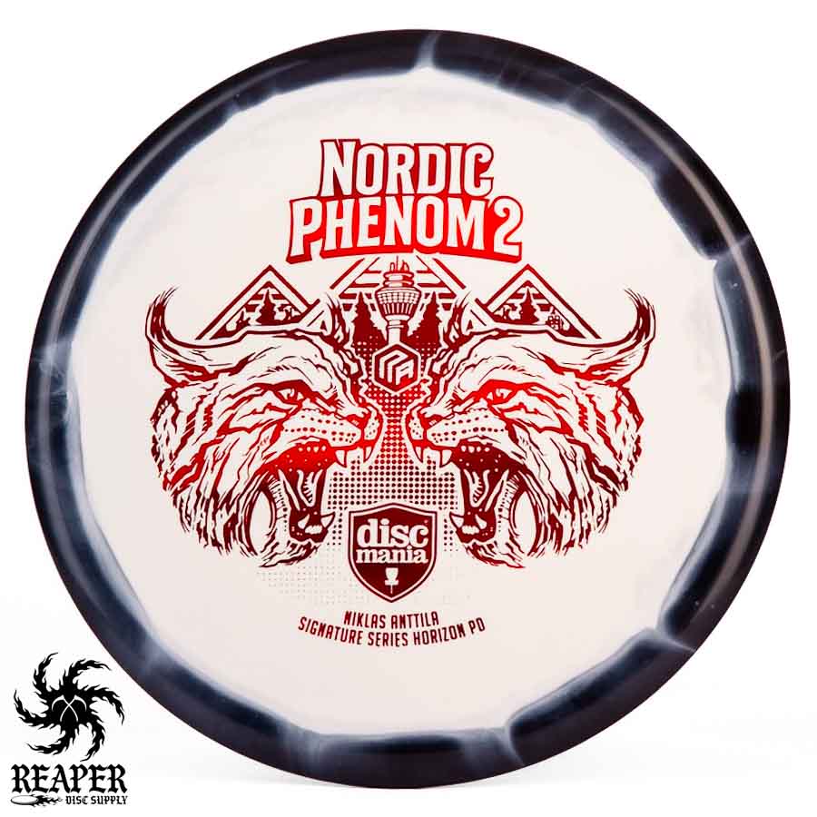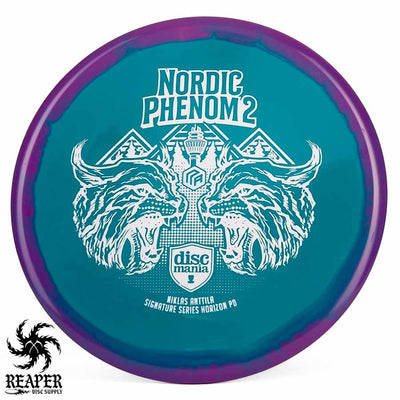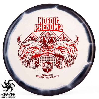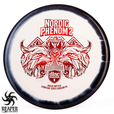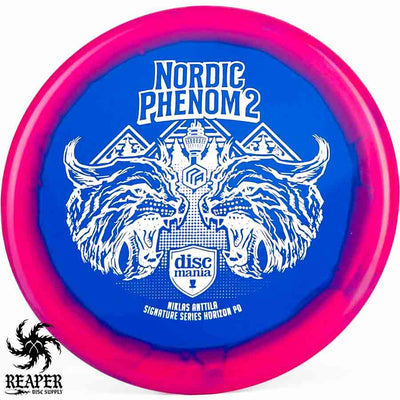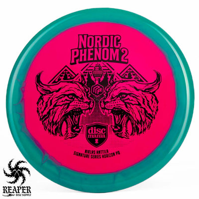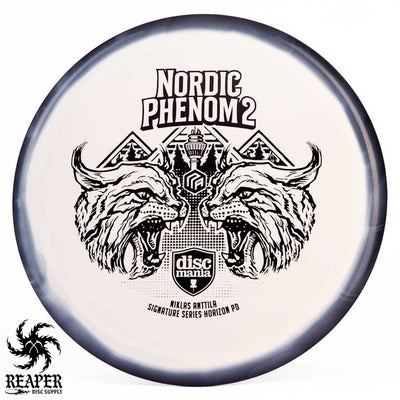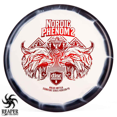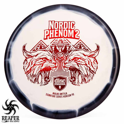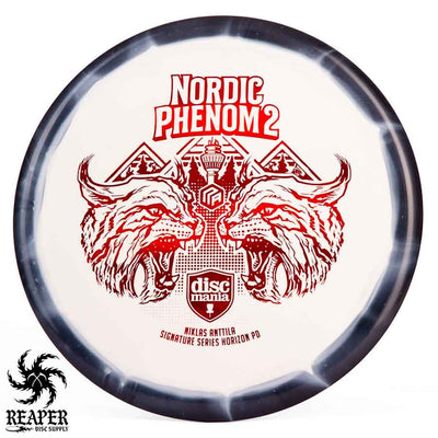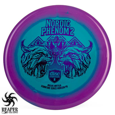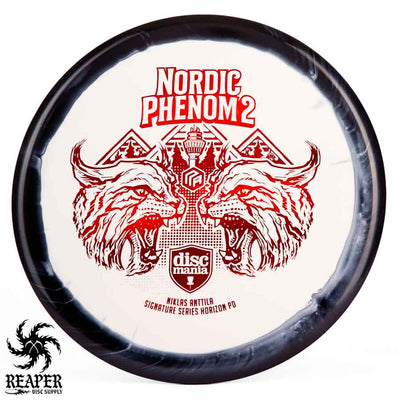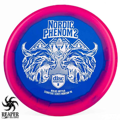 Discover the marvelous Discmania Nordic Phenom 2 Horizon S-Line PD, a signature selection of Niklas Anttila. Crafted from Horizon S-Line plastic, it showcases artful two-tone color variations and an eye-catching Lynx design.