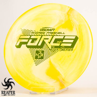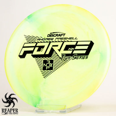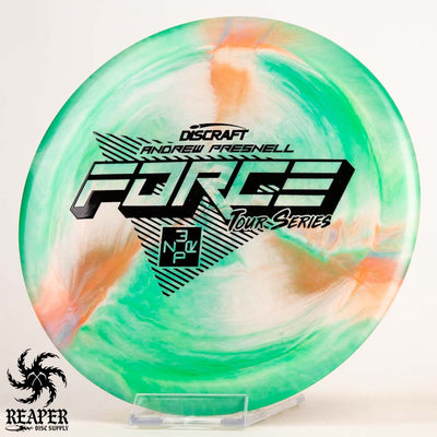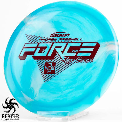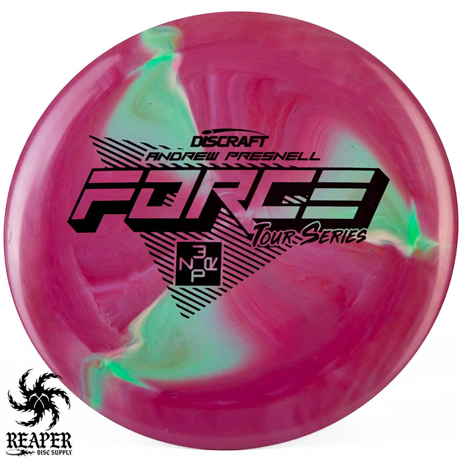 The 2022 Andrew Presnell Tour Series Force is an overstable distance driver made with durable swirly ESP plastic. Players like Andrew and Paul McBeth use the Force as their go-to driver, and in this beautiful swirly plastic it is a must-have. Throw a Discraft Tour Series Force in your bag today!