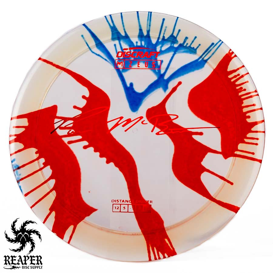 The Discraft Z Fly Dye Zeus is a premium distance driver for powerful, long-distance shots. It is part of the official Paul McBeth line and co-designed by McBeth himself. It boasts flight numbers of Speed 12, Glide 5, Turn -1, and Fade 3. This provides a reliable combination of high speed, excellent glide, a slight turn, and a strong fade. This overstable disc delivers predictable distance, making it ideal for intermediate and advanced players.