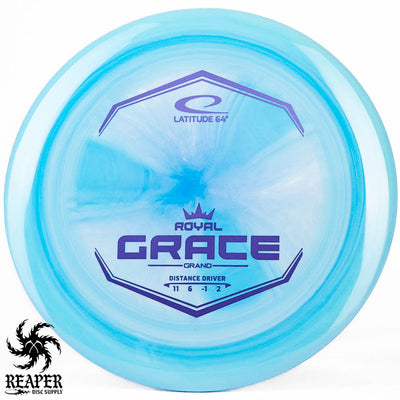 The Latitude 64 Royal Grand Grace is the perfect max distance driver for intermediate players looking to venture into the stable driver category. Made with Latitude 64's highly sought after Royal Grand plastic, these discs are grippy and durable. The flight of the Royal Grace is very glidey and dependable. When thrown flat, the Grace will flex out to the right a tad (depending on how much hyzer you put it on) before slowly turning back over and finishing with a decent amount of predictable fade.