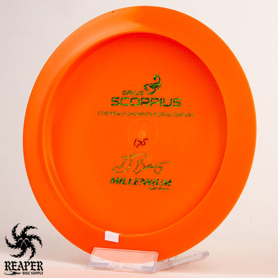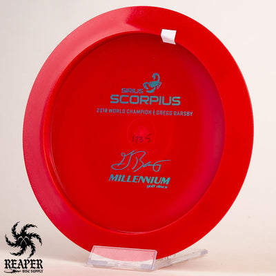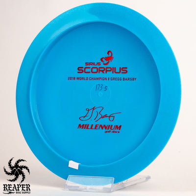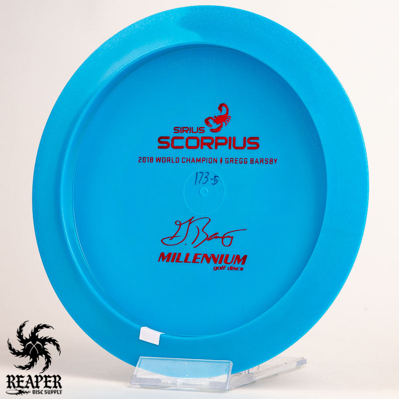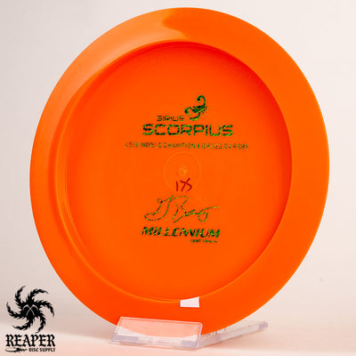 The Millennium Sirius Gregg Barsby Scorpius is an overstable disc golf driver with a cool bottom stamp. Watch any tournament that Barsby plays and you will see him throw his Scorpius for a ton of different shots.