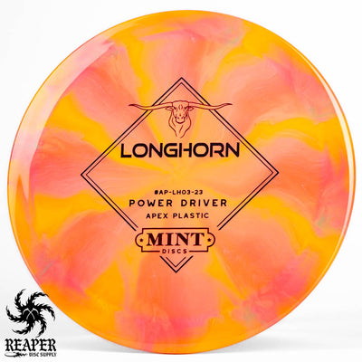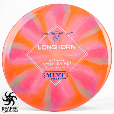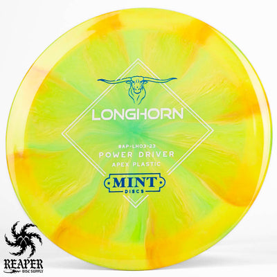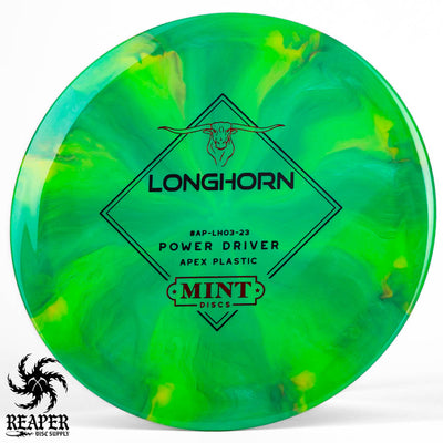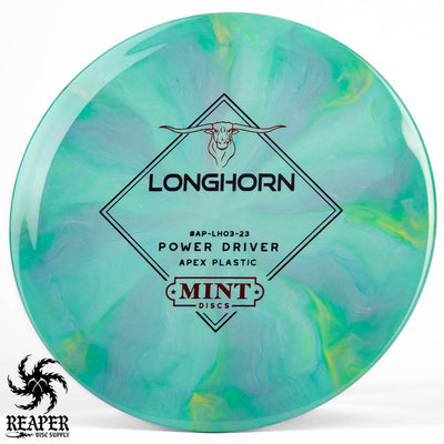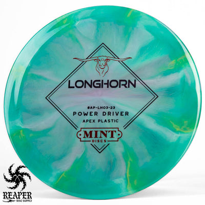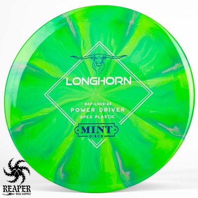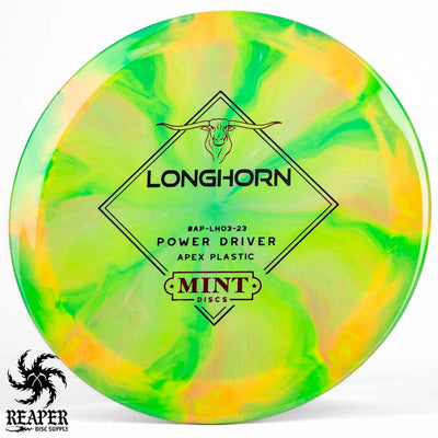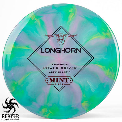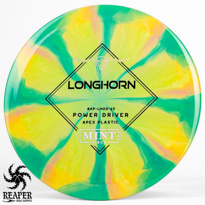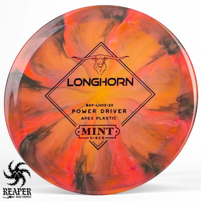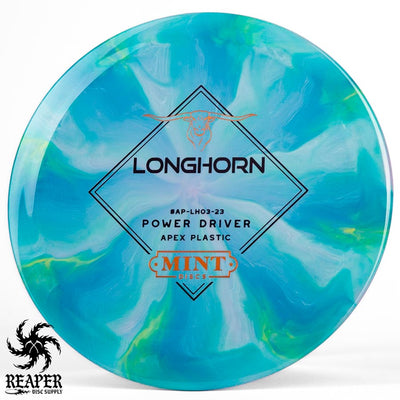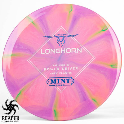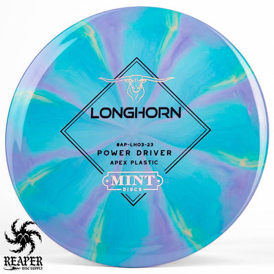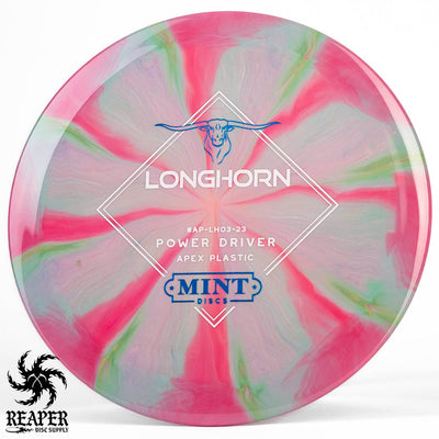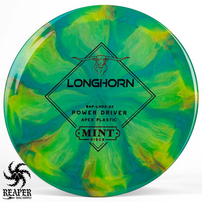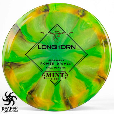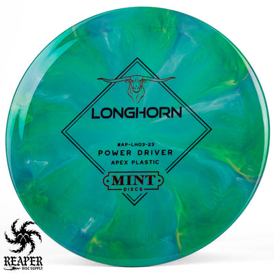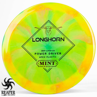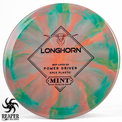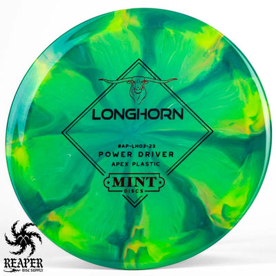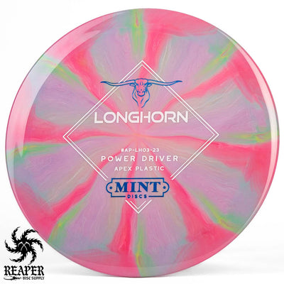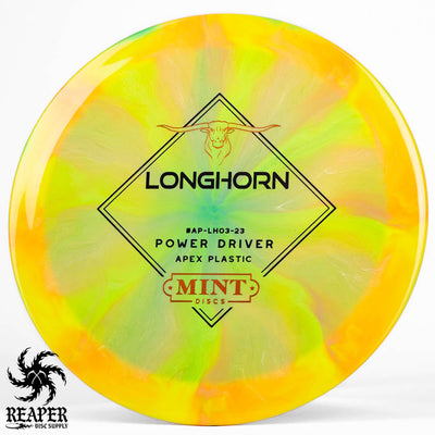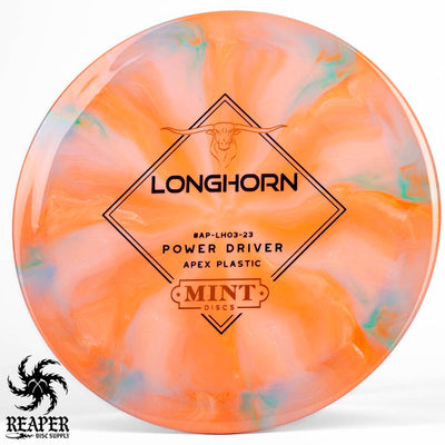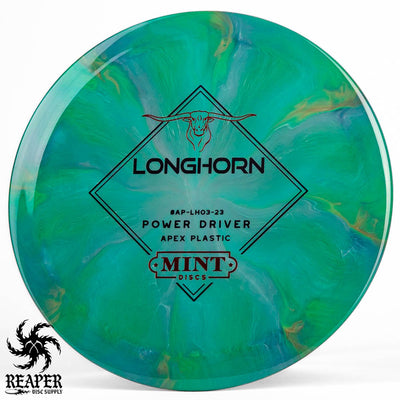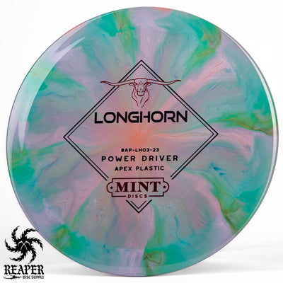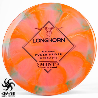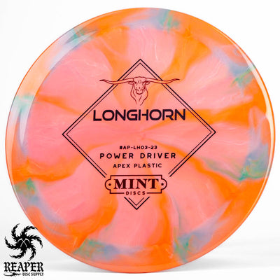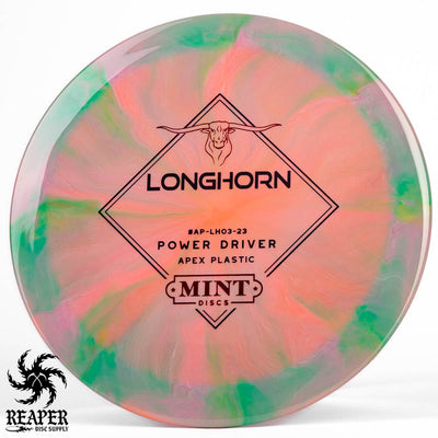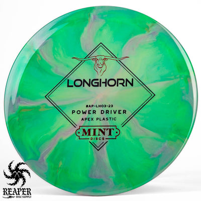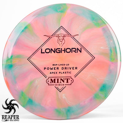 Welcome the Mint Discs Apex Longhorn, a disc that's as fierce as it sounds. Its premium Apex plastic, with insane swirls in this run, offers a killer grip and durability that sticks around longer than that regrettable tattoo. Bonus? It's got extra glide for that satisfying forward carry.