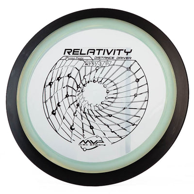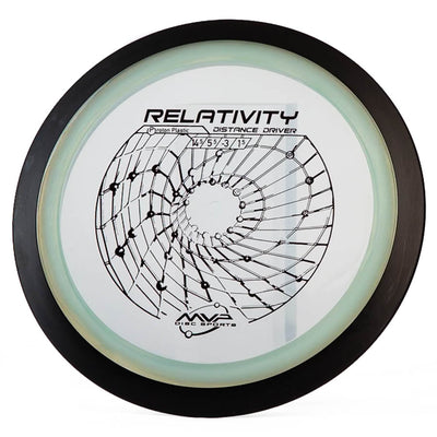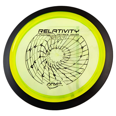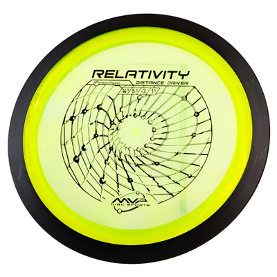 The MVP Proton Relativity is a premium understable distance driver that combines high-speed performance (14.5/5.5/-3.0/1.5) with dependable control, perfect for shaping turnover lines and maximizing distance. Built with MVP's signature two-piece construction, featuring a durable Proton plastic flight plate and black rim, this 24.5mm wide-rim disc delivers consistent flights while preventing unwanted rollers through its reliable fade. Whether you're executing controlled turnovers, strategic rollers, or high-line distance shots, the Relativity's responsive nature caters to both power throwers seeking precision and developing players looking for a forgiving distance driver.