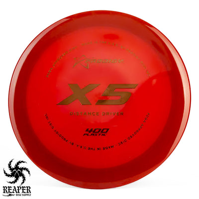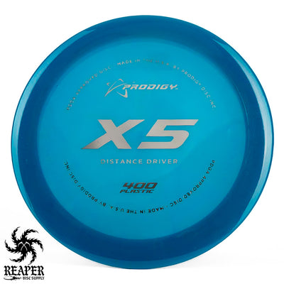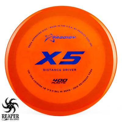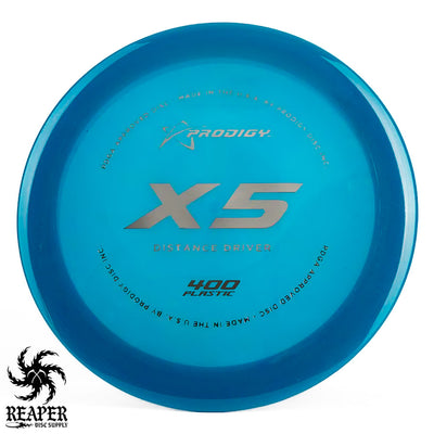 The Prodigy 400 X5 is a durable, understable distance driver, perfect for players seeking consistent, high-speed performance. Made from Prodigy's popular 400 plastic, it offers excellent grip, even in wet conditions, and a stiff rim for added control. Its versatility and comfort make it great for any skill level.