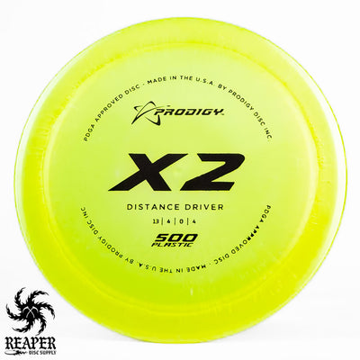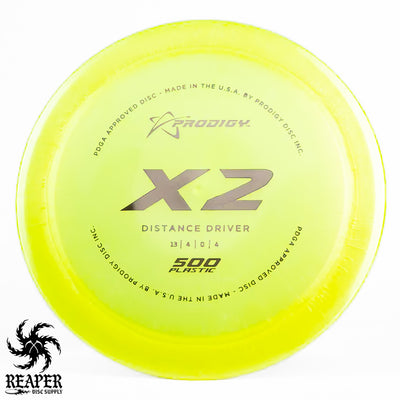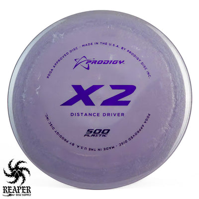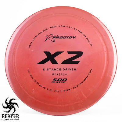 The Prodigy 500 X2, with its premium 500 plastic, offers a less gummy and more confident grip, ideal for players seeking a stiffer flight plate. Its durability and pearlescent finish combine performance with visual appeal, providing a dependable, overstable flight with a rating of 13|4|0|4.