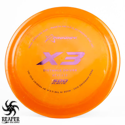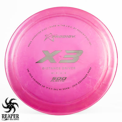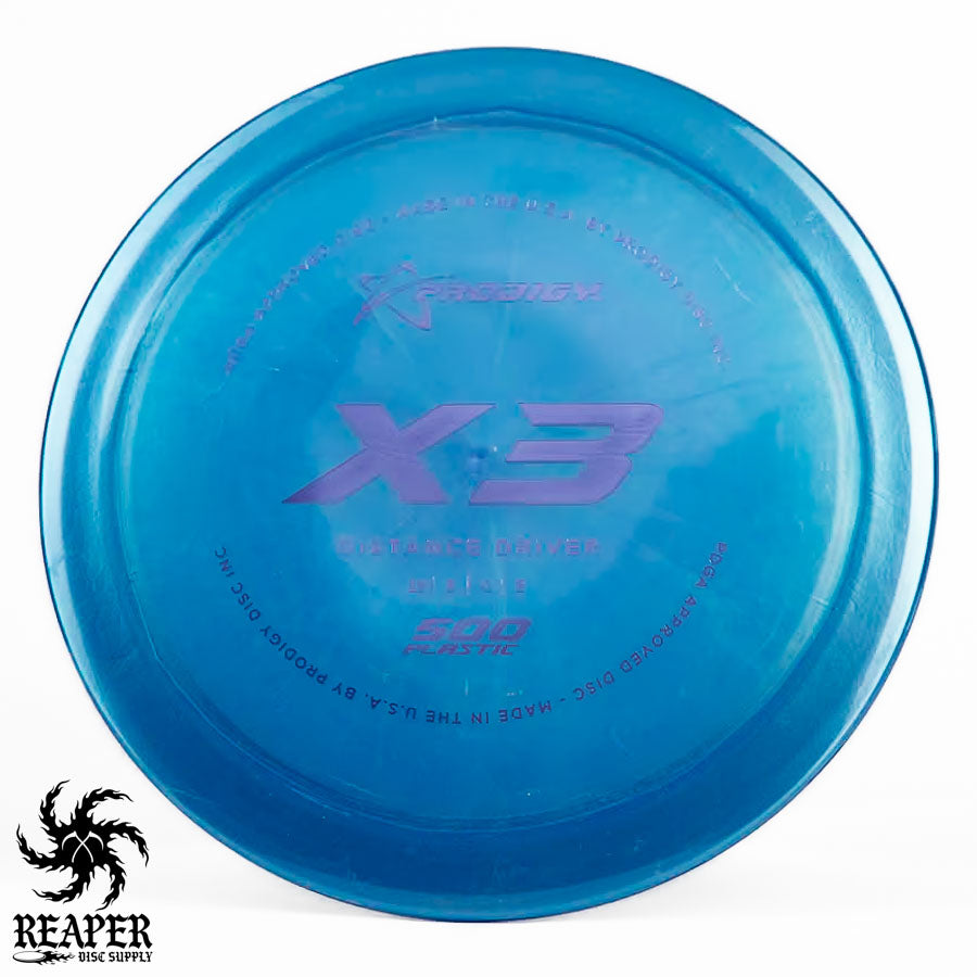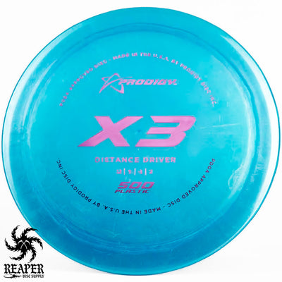 The Prodigy 500 X3 is a slightly overstable distance driver, designed for all skill levels. Crafted from Prodigy's premium 500 plastic, it provides a confident grip, stiffer flight plate, and a balance of flex and firmness. Its pearlescent finish adds a unique visual element, enhancing its appeal.