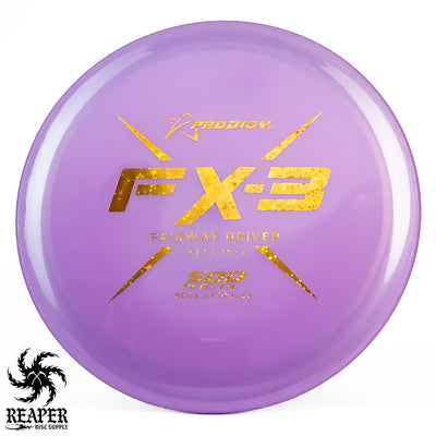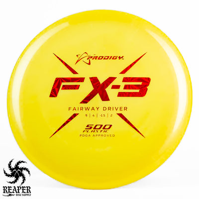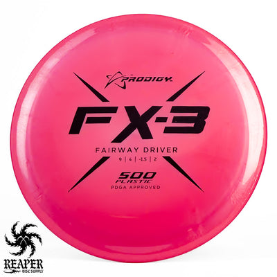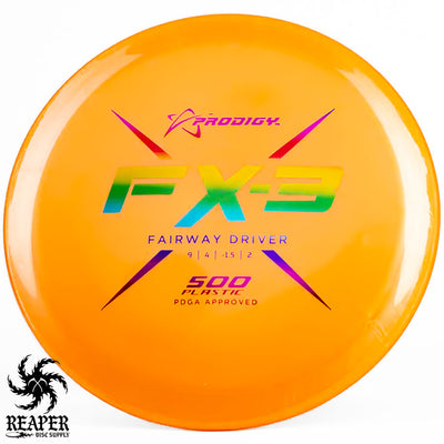 The Prodigy 500 FX-3 is a premium control driver molded from Prodigy's 500 Plastic, known for its pearlescent sheen and high durability. This disc offers a confident grip with a perfect blend of stiffness and flexibility for accurate and consistent flights. Ideal for players seeking a reliable fairway driver, the 500 FX-3's construction promises a steady presence in your bag with its enduring performance and visual appeal.