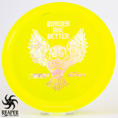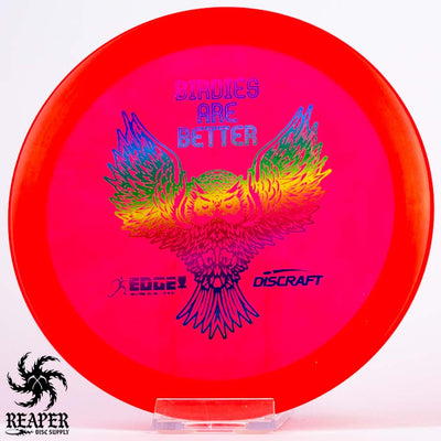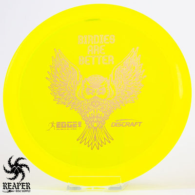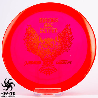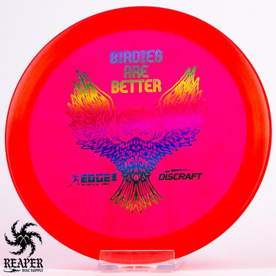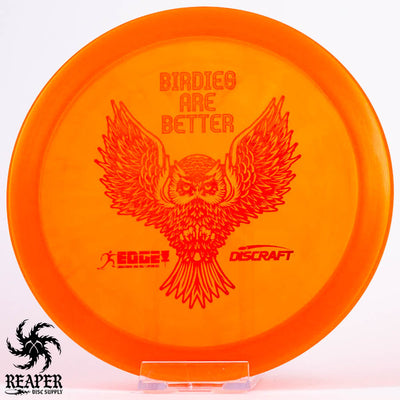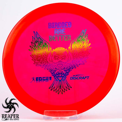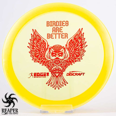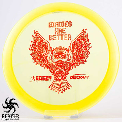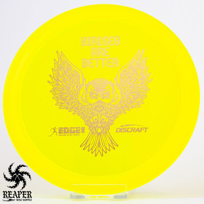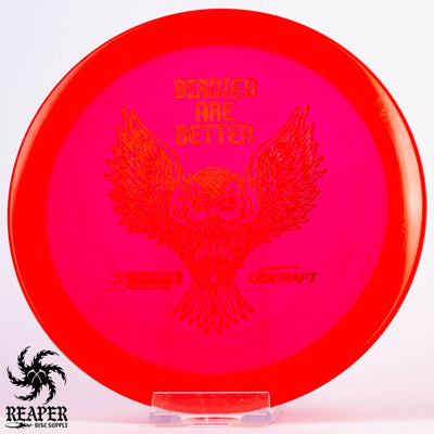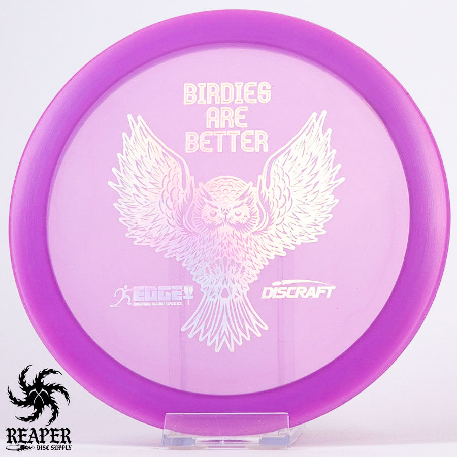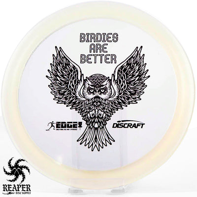Our design features a hand-drawn owl with the text "birdies are better." We designed this stamp in collaboration with Jay Reading, a founding member of EDGE and a professional disc golfer with over 100 PDGA wins.