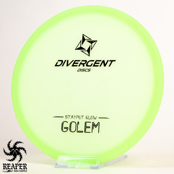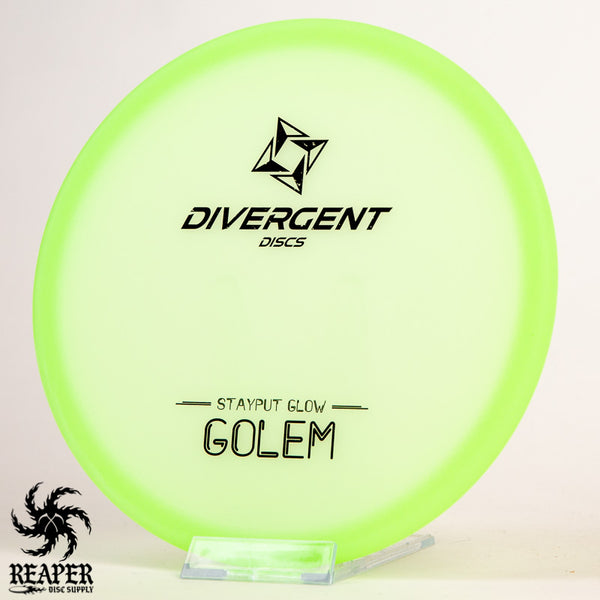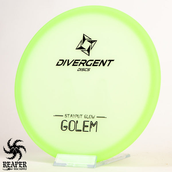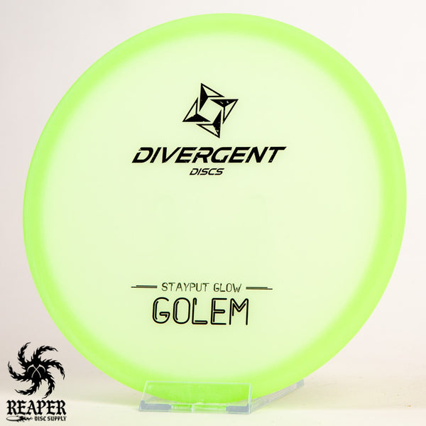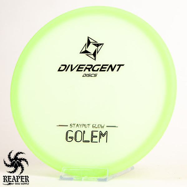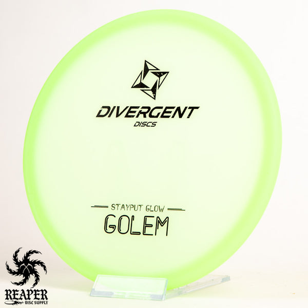 The Divergent Discs Glow Golem is a disc golf approach disc made with bendable StayPut glow-in-the-dark rubber plastic.
