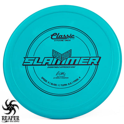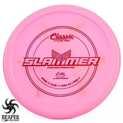 Crafted in collaboration with 2x World Champion Ricky Wysocki, this super overstable putt & approach disc delivers unparalleled consistency and predictability for intermediate and advanced players. Whether you prefer throwing backhand or forehand, the Classic Blend Slammer is your go-to choice for reliable finishes, even in strong headwinds. With a speed of 3, a glide of 1, a turn of 0.5, and a fade of 4, it's perfect for upshots and windy situations. Enhance your game with the slamming power of the Classic Blend Sockibomb Slammer today!