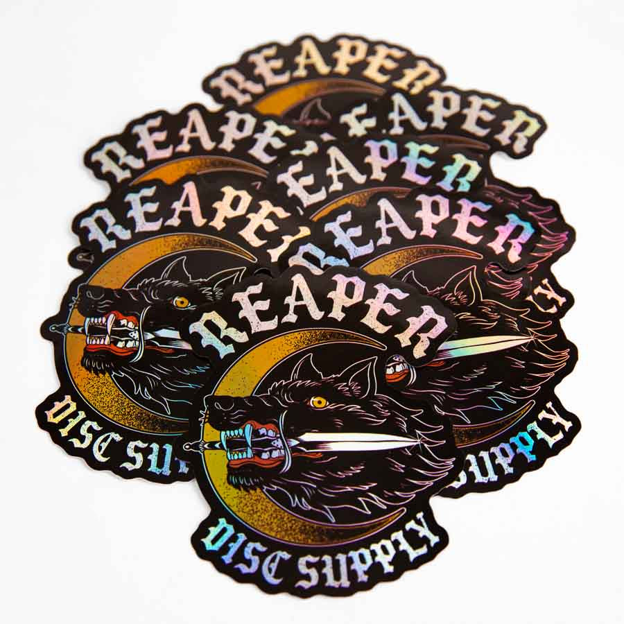 A holographic disc golf aluminum sticker that features a a hand-drawn wolf and dagger design. These are about 4" long and made with permanent adhering all-weather aluminum. Only comes with one sticker; photo for illustrative purposes only.