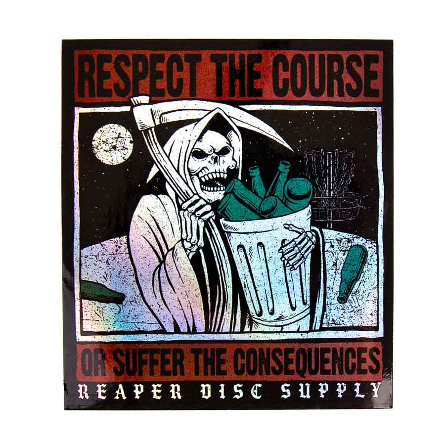 These are holographic disc golf stickers with our hand-drawn 'Respect The Course' design. They stand about 4 inches tall and are made of permanent all-weather aluminum that adheres to almost any surface.