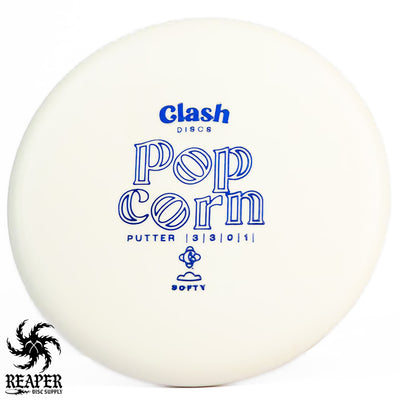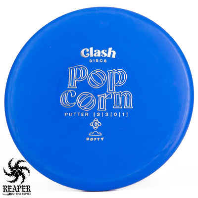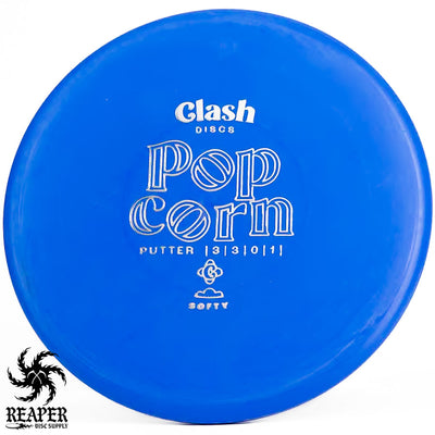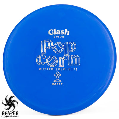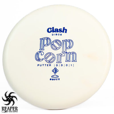 The Clash Discs Popcorn in Softy plastic is a straight-flying putter, known for its flexibility and grip. Clash's Softy plastic enhances the disc's feel in the hand, especially in colder weather or for players who prefer a more flexible disc. This version of the Popcorn maintains its straight flight path and is well-suited for putting and controlled approaches, providing reliable performance with a softer touch upon landing.