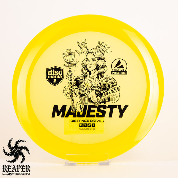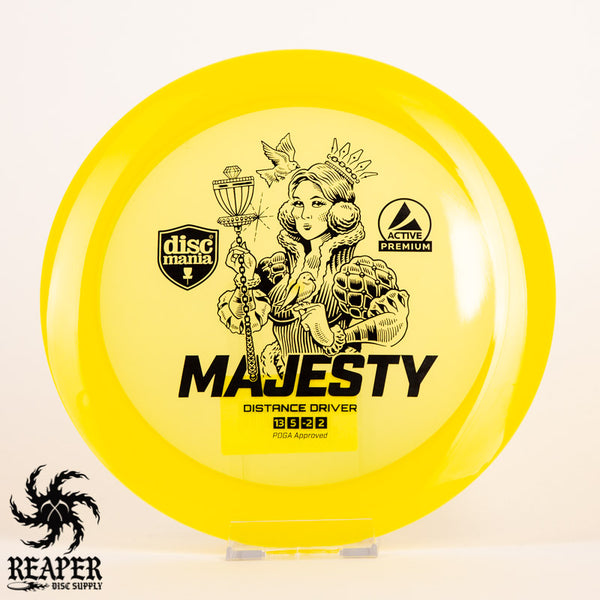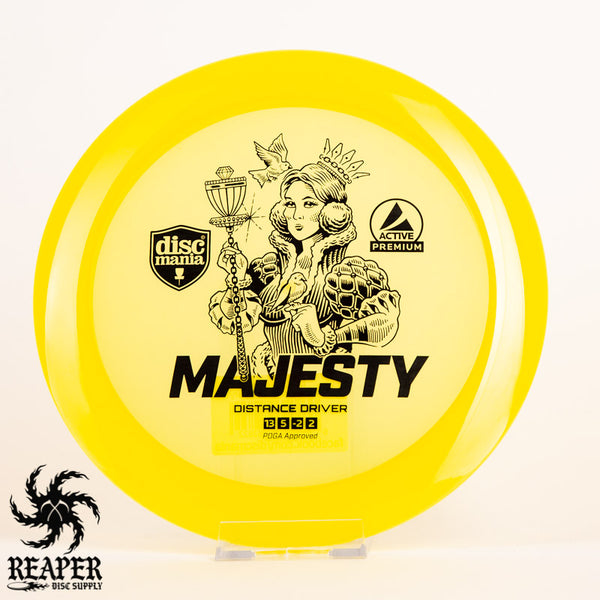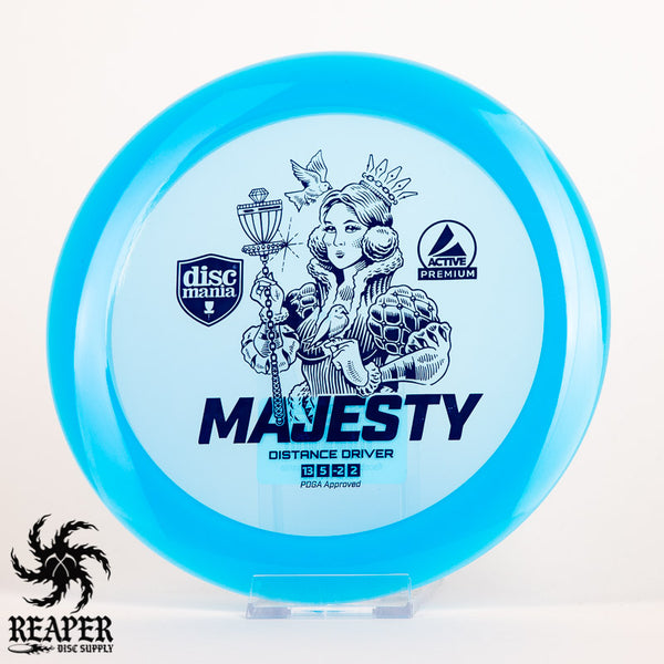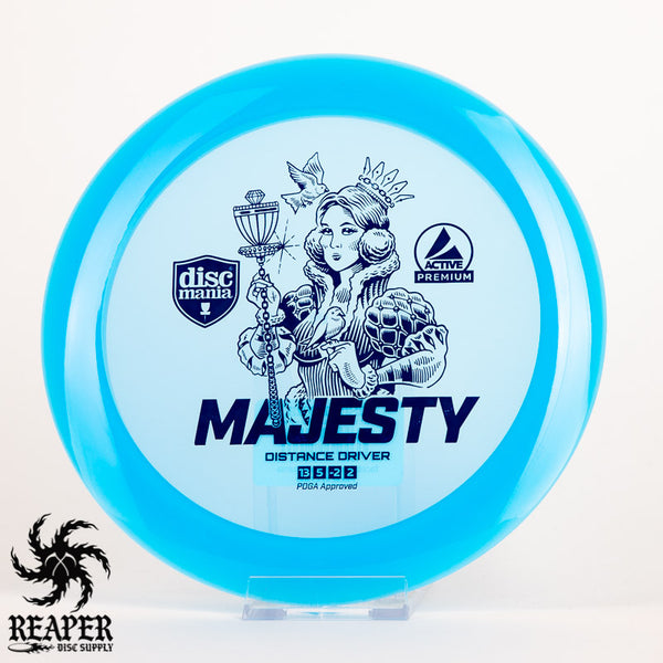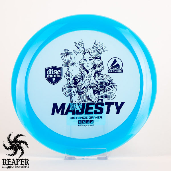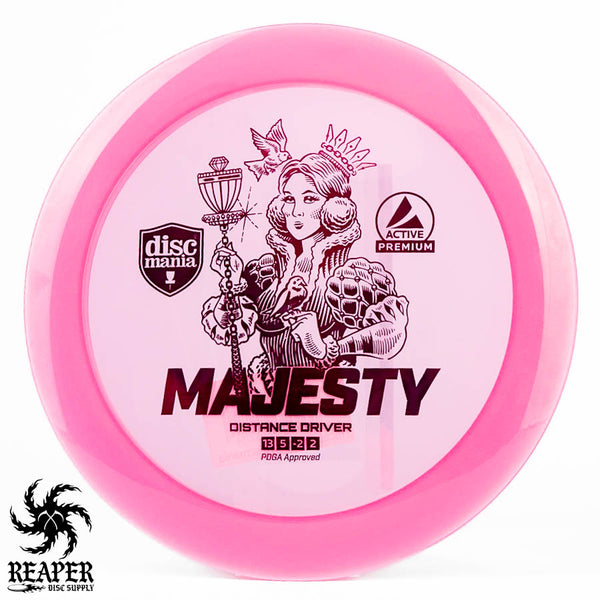 The Discmania Active Premium Majesty is a high-speed distance driver designed for long-range shots. Discmania's Active Premium plastic is one of the best gripping translucent plastics that can take a ton of damage without losing stability.