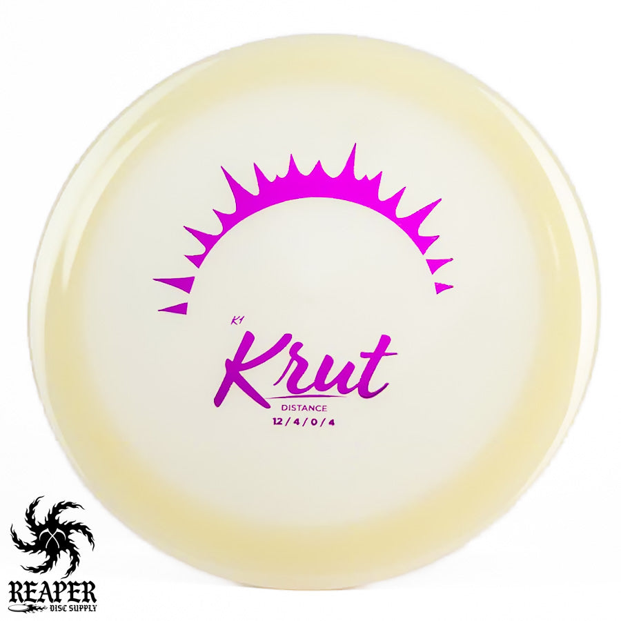 The Kastaplast K1 Glow Krut is an overstable distance driver that promises consistency and control. Its glow-in-the-dark K1 plastic ensures visibility during dusk or night rounds, while its flight characteristics offer a strong resistance to wind with a pronounced and reliable fade. Ideal for players seeking a trustworthy disc for both forehand and backhand drives.