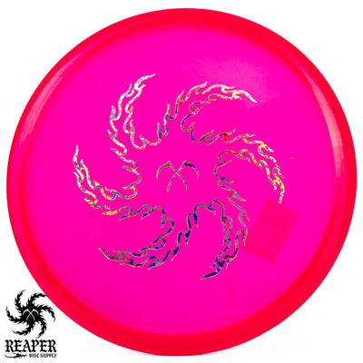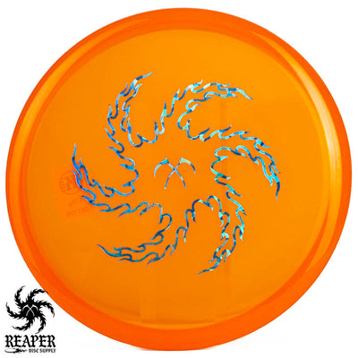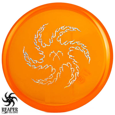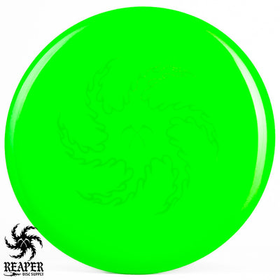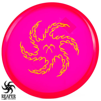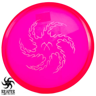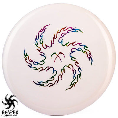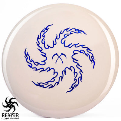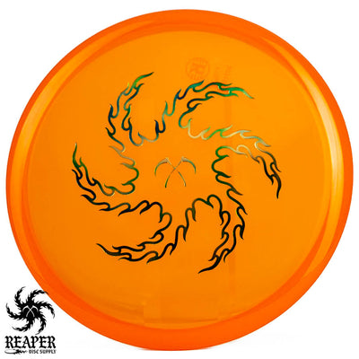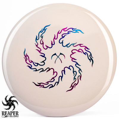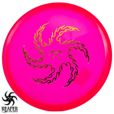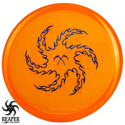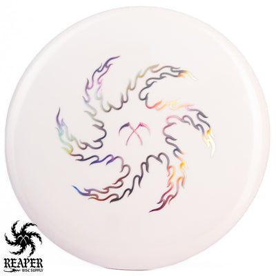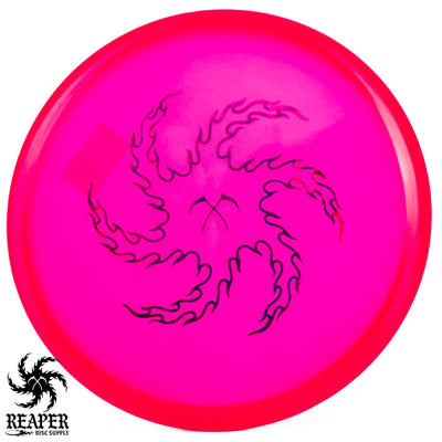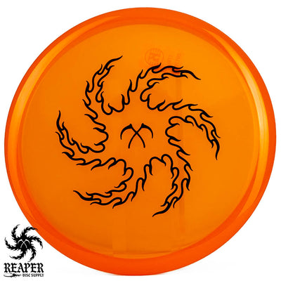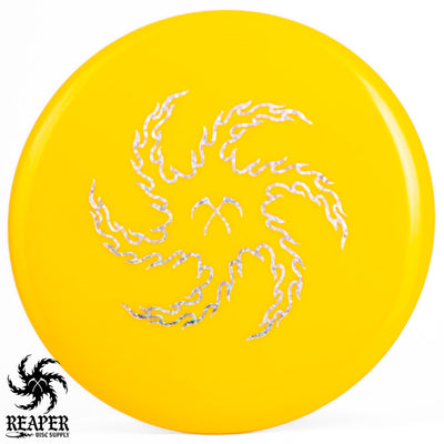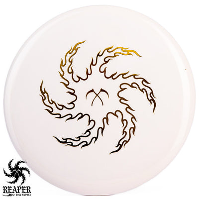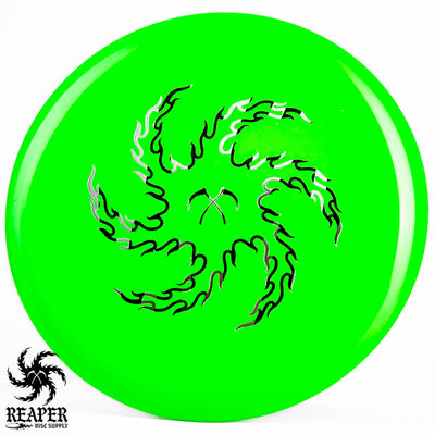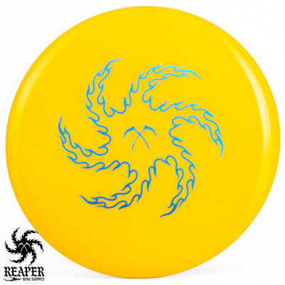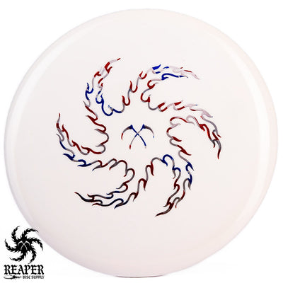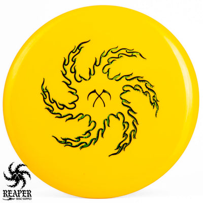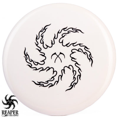 Here's the Kastaplast K1 Svea (Reaper Edition), a custom stamped midrange disc that is only available on our site. Featuring our striking flame vortex logo, this K1 plastic understable midrange provides superior grip and durability. Perfect for beginners and players with weaker arms, the K1 Svea confidently maintains its line, ensuring a reliable flight path on wooded courses.