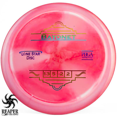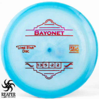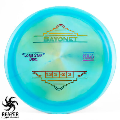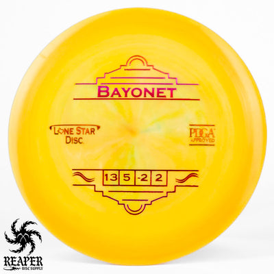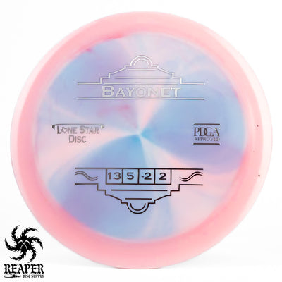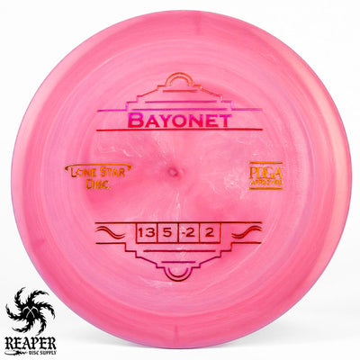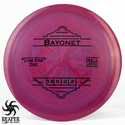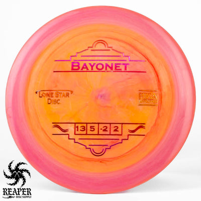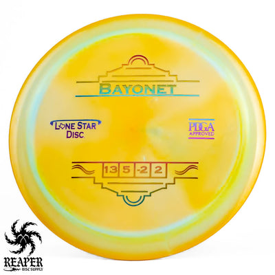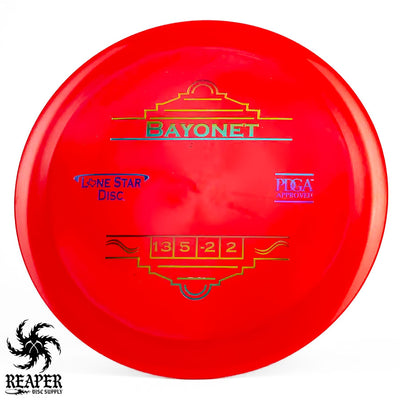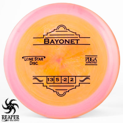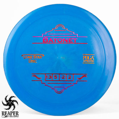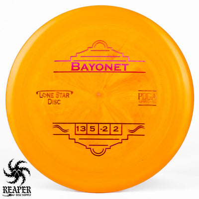 The Lone Star Bayonet in Bravo plastic is a fast, glidey and stable disc golf distance driver. For players with enough arm speed, the Bayonet will fly straight and was designed for maximum distance off the tee. When you really crank this disc it has quite a bit of high speed turn and is perfect for huge S-lines and hyzer flips (very similar flight to a Shryke). Check out the Lone Star Discs Bayonet if you think you have the arm speed to handle it ;)